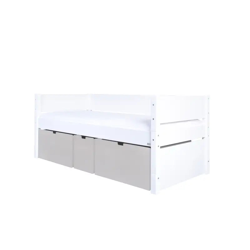 Enkelseng Nanna med høje skuffer i silver kombinerer stil og funktionalitet, perfekt til ethvert moderne børneværelse.